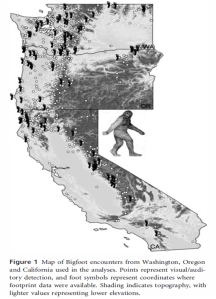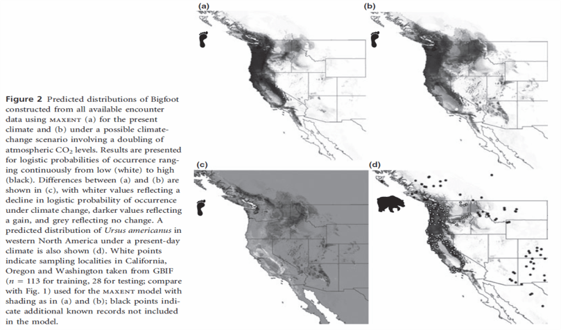 These climate models have been used for many different taxa, but recently I came across the first example of such a model being applied to a cryptid.  “Cryptid” is the name given to any postulated species that has not been conclusively documented.  Notable examples include the Loch Ness Monster in Scotland and the Chupacabra in Mexico.  This study used a database of Sasquatch sightings from the western USA to infer the climatological requirements of this particular cryptid.  The point of the study was to demonstrate that researchers can provide apparently meaningful data without any actual biological understanding of the concepts.  In this case, we have little or no evidence of the existence of Sasquatch, and yet the researchers published an entire paper documenting its distributions.