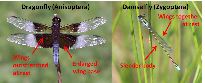 It is fairly easy to tell them apart in the field.  Anything that looks like what most people would call a “dragonfly” is a dragonfly.  The damselflies are more subtle and dainty (hence the name “damsel” flies).  They have been described as “flying neon toothpicks in the grass” and that is a pretty good description!  Here’s a comparison of the two groups as you might see them in your backyard: