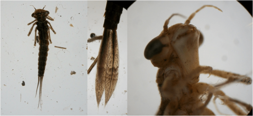 Both groups have nymphs (as it is called in species such as these where the juvenile stages resemble the adult – where the young form looks “more like a maggot” they are termed “larvae”) which live in the water and feed on insects and fish.  If you ever come across these critters in the water they can be easily distinguished.  Here is a photograph of a damselfly nymph that I took from my specimens: