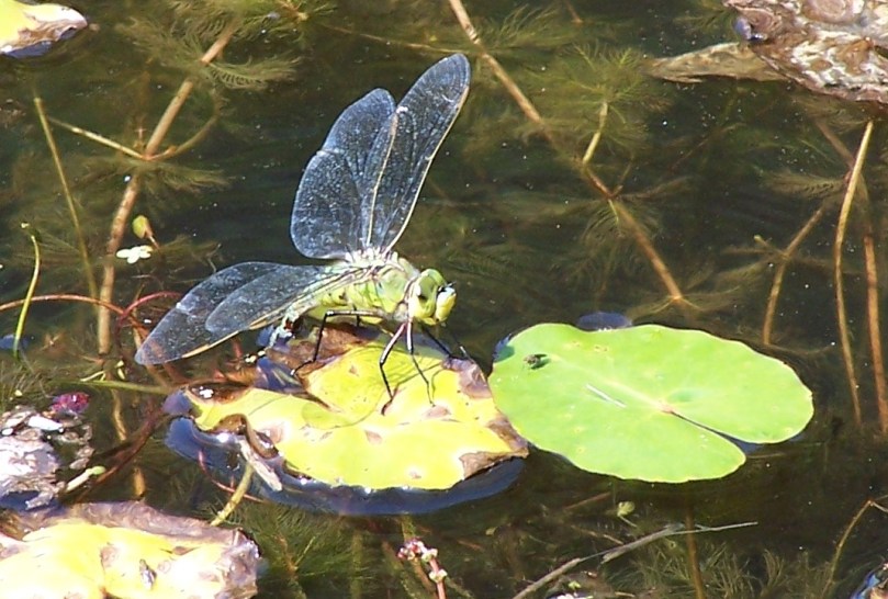 In this photograph you can see a female ovipositing (laying eggs) into the stem of a water lily. Odonates vary in where they lay their eggs, with some laying in open water, some on the surface of plants and some, like this emperor female, on the inside of plants. The females of these latter species have sharp, pointed appendages called ovipositors through through which they lays eggs and they use these to cut open the plant stems to insert the eggs. Other species also have ovipositors but they tend not to be as sharp. These appendages can be used to inflict damage both on other odonates and on unwary entomologists… They were thought to sting, hence the various folk names that they were given: “horse stinger”, “devil’s darning needle”, “troll’s spindle”.