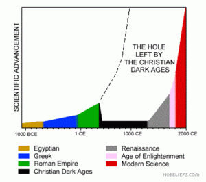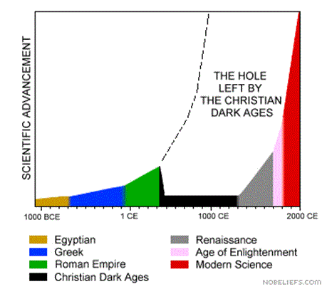 It is easy to argue that the Dark Ages (largely the product of religious leanings) delayed global technological development (see below for a graph illustrating, albeit qualitatively, this concept). This may seem like a bad thing, but had we developed more quickly, we may have destroyed the planet more quickly. David Quammen (who Ottawa-based CFI-ers were lucky enough to see a few months ago) once said that the horrific diseases caused by the mosquito are the single greatest protection that the rainforest has. Detrimental phenomena can be a positive when they dissuade us from a potentially destructive path. Those points aside, I think religion has been largely neutral.