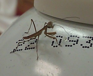 So our lab ordered some mantids from Home Depot (which don’t seem to be available so I presume it’s a seasonal product) for predation experiments. I was under the impression that they needed specific conditions to hatch that wouldn’t be met until next June. Then someone noticed one crawling over a desk. Sure enough, there were a few dozen wandering aimlessly about, migrating away from the egg case that was sitting in a corner of the lab. I think we got most of them, but those that we didn’t catch should take care of our fruitfly problem!